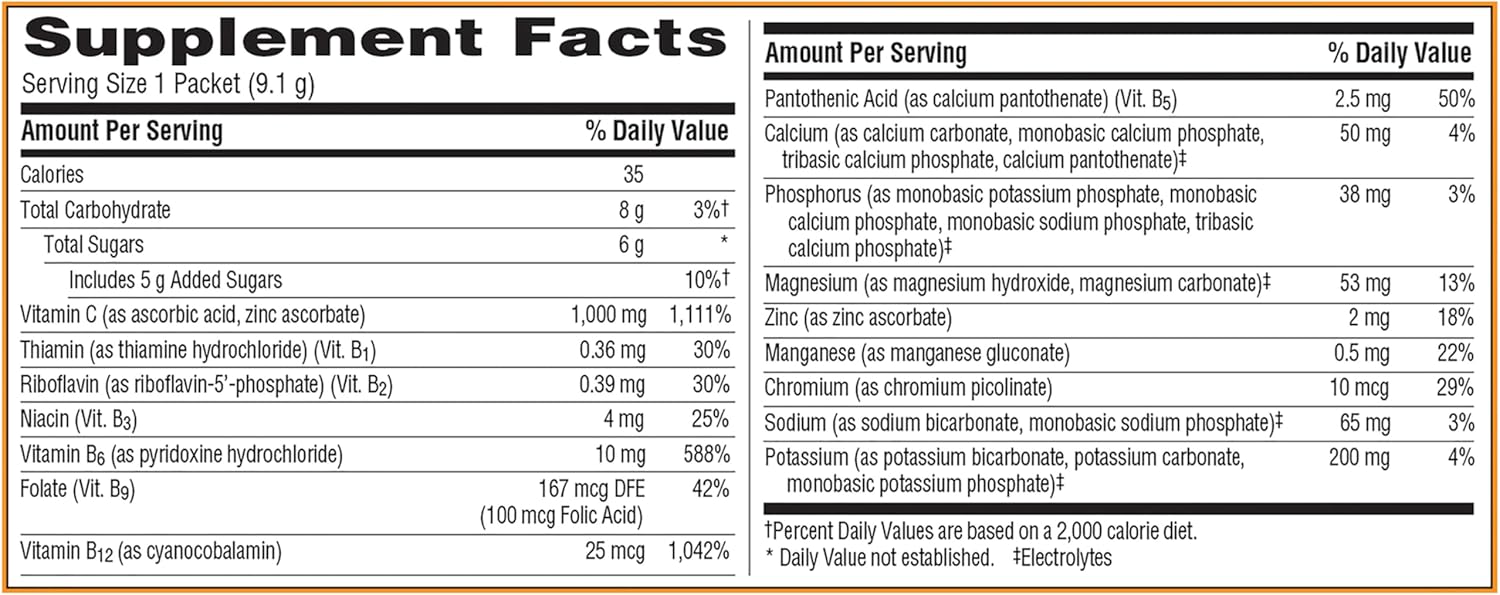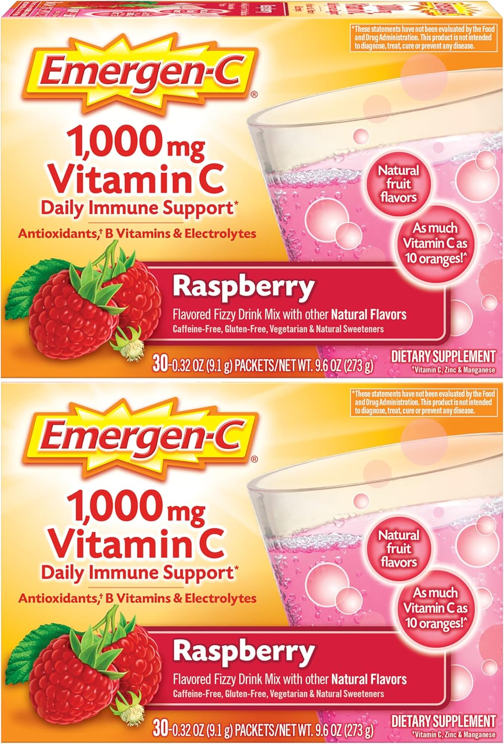 Emergen-C 1000mg Vitamin C Powder. with Antioxidants. B Vitamins and Electrolytes. Vitamin C Supplements for Immune Support. Caffeine Free Drink Mix. Raspberry Flavor – 60 Count/2 Month Supply