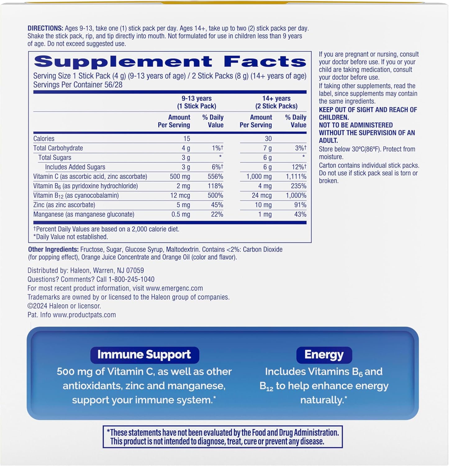 - Box of 56 Stick Packs of orange vitality flavored Emergen-C Crystals. On-the-Go Emergen-C Immune Support (1) Supplement with Vitamin C. B Vitamins. Zinc and Manganese
